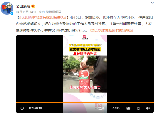 4月8日,湖南長沙。長沙縣圣力華苑小區(qū)一住戶家堆放有雜物的陽臺突然燃起明火,好在業(yè)委會及物業(yè)的工作人員及時發(fā)現(xiàn),并第一時間展開處置,大家快速控制住火勢,并在5分鐘內(nèi)成功將火撲滅。