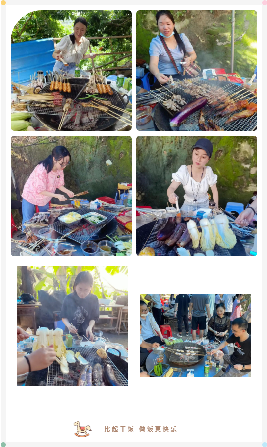 到達(dá)目的地后,大家按照部門分組進行物資分配。大家分工明確,有人洗菜,有人串制食物,配合默契,忙得不亦樂乎!