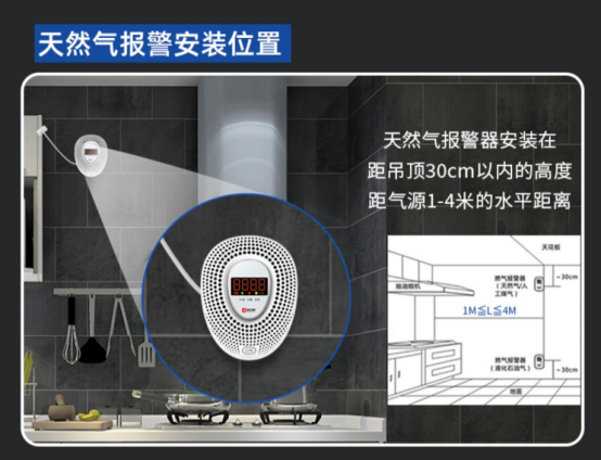 ⑴、當(dāng)檢測(cè)的可燃?xì)怏w為天然氣、人工煤氣、沼氣時(shí),考慮到這些氣體比空氣輕,泄漏后會(huì)漂浮在空氣上方,因此,報(bào)警器需安裝在比天花板低0.3-1.0m的位置,氣源與氣源的距離不應(yīng)超過1.5m,以保證檢測(cè)靈敏度。