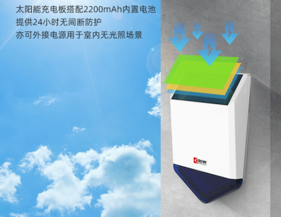 在供電方面,這款報(bào)警器采用了交流、直流兩種供電方式,室內(nèi)外場(chǎng)景都可以用。室內(nèi)場(chǎng)景使用時(shí),外接DC5V電源即可;室外場(chǎng)景使用時(shí),它頂部的太陽(yáng)能充電板搭配內(nèi)置的2200毫安電池可為該報(bào)警器提供24小時(shí)無(wú)間斷電流。