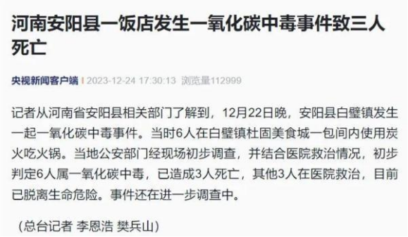2023年12月22日晚,河南省安陽縣白璧鎮(zhèn)也發(fā)生一起一氧化碳中毒事件。當(dāng)時6人在包間內(nèi)使用炭火吃火鍋,結(jié)果導(dǎo)致6人一氧化碳中毒,3人死亡。