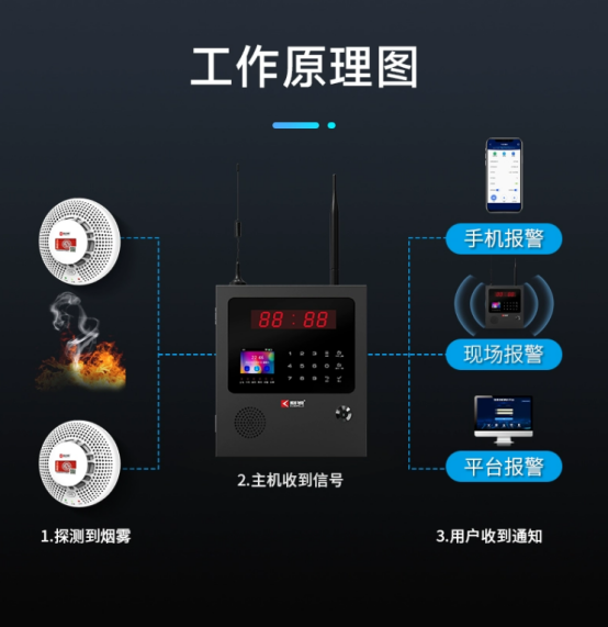 安裝有此設(shè)備的人員密集場(chǎng)所、易發(fā)火災(zāi)場(chǎng)所,一旦煙霧探測(cè)器探測(cè)到了煙霧,會(huì)立刻高音報(bào)警,并向消防報(bào)警器主機(jī)發(fā)出報(bào)警信息,主機(jī)接收到煙霧探測(cè)器發(fā)來(lái)的報(bào)警信息后,現(xiàn)場(chǎng)高音報(bào)警的同時(shí)還會(huì)通過(guò)多種方式向用戶告警。