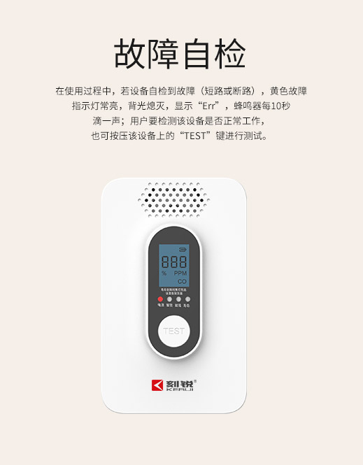 此外,這款報(bào)警器還具有故障自檢功能,在使用過程中,若設(shè)備自檢到故障(短路或斷路),黃色故障指示燈常亮,背光熄滅,顯示“Err”,蜂鳴器每10秒滴一聲;用戶要檢測該設(shè)備是否正常工作,也可按壓該設(shè)備上的“TEST”鍵進(jìn)行測試。