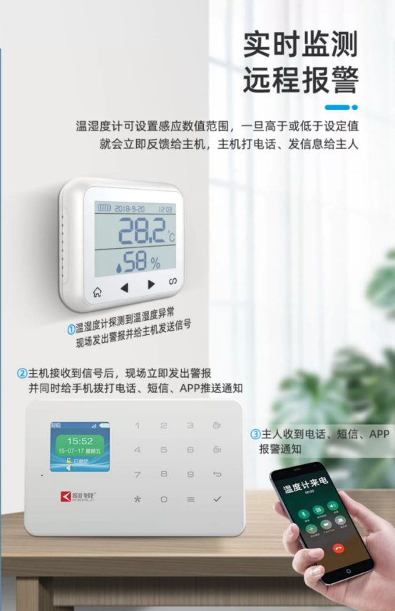 這款報警器還支持自定義報警溫濕度的數(shù)值,當被測環(huán)境中的溫濕度值達到設定上下限時會立即報警。此外,它還能連接刻銳報警主機,通過電話、短信、手機APP信息等多種方式遠程報警,提示用戶。