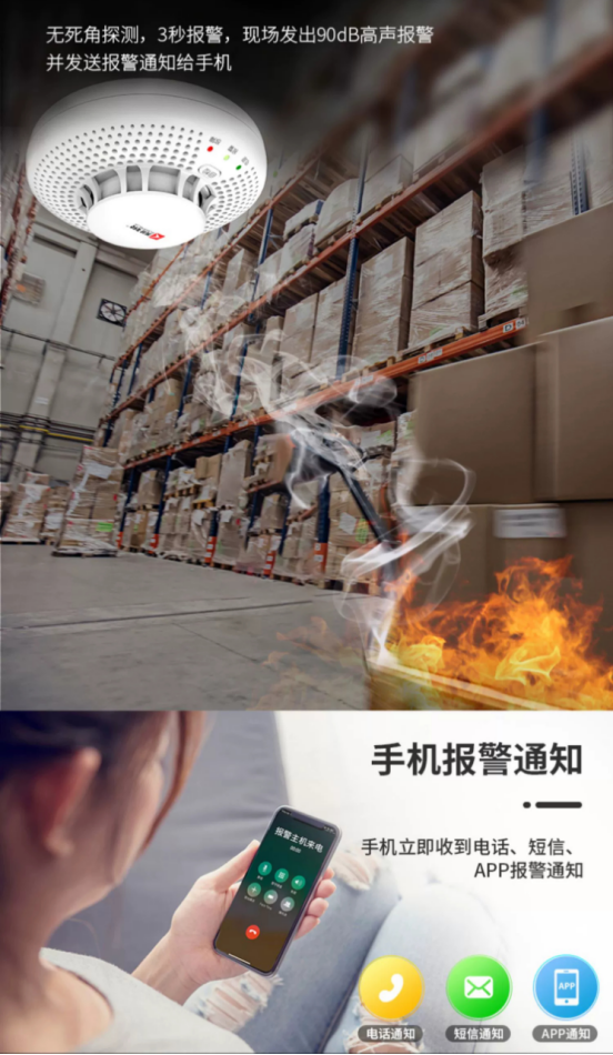 安裝有此設(shè)備的場所,一旦空氣中的煙霧濃度達到該設(shè)備所設(shè)定的警戒值,就會發(fā)出高分貝的報警聲,并通過電話、短信、手機APP等多種方式向用戶遠程告警,讓用戶能夠及時采取應(yīng)對措施。