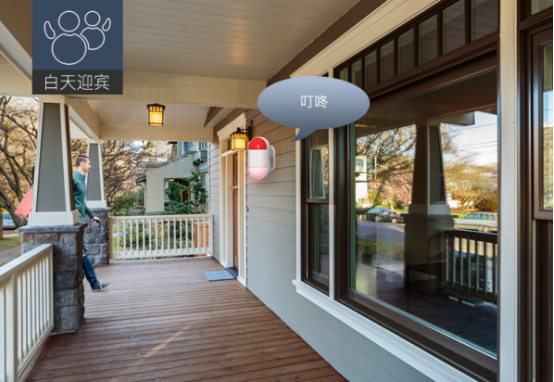 白天當(dāng)家居的門鈴使用時,只要它內(nèi)置的紅外探測器(內(nèi)置或外置的)感應(yīng)到有人時,它就會響起清新的音樂或者親切的迎賓語音,用戶就會知道有客人來訪。