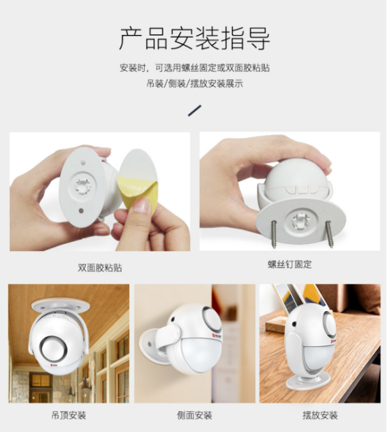 在安裝上,這款紅外報警器也是很方便,無需布線,可螺絲固定也可粘貼安裝,可頂裝也可采用壁掛安裝,底座上的旋轉(zhuǎn)支架還可以讓用戶根據(jù)安裝位置的不同,來調(diào)節(jié)可探測的距離,這樣就可以方便用戶選擇想要安裝的位置。