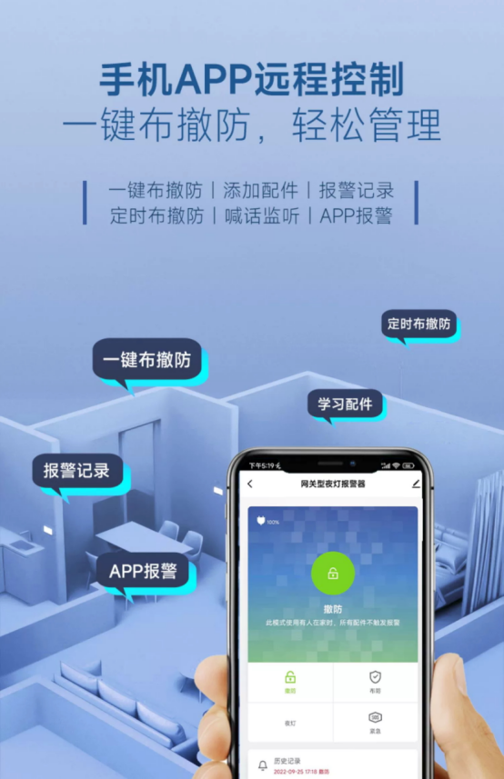用戶還可以通過手機(jī)APP對它進(jìn)行布撤防、監(jiān)聽、喊話、開關(guān)警號(hào)等遠(yuǎn)程操控,這些功能,對于那些平常工作加班多,家里又無人照看的人士非常適用,在易發(fā)生盜竊的時(shí)間段,通過手機(jī)APP一鍵就可以實(shí)現(xiàn)遠(yuǎn)程布防,非常方便。